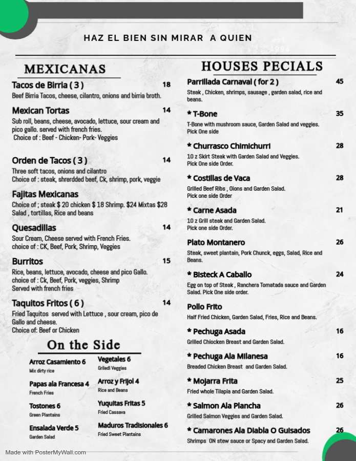 Egg on top of Steak, Ranchera Tomatada sauce and Garden Salad. Pick One side order.